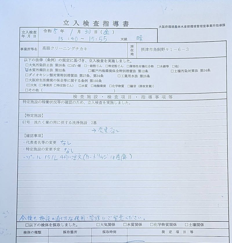 先日大阪府の環境管理室の水質指導グループの方々が抜き打ちで立入検査に来られました。機械の設置場所や機械の変更はないか石油系溶剤の使用量やカートリッジの産業廃棄物処理水洗機の排水使用薬品…